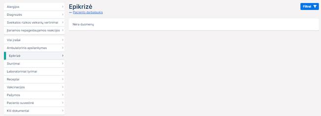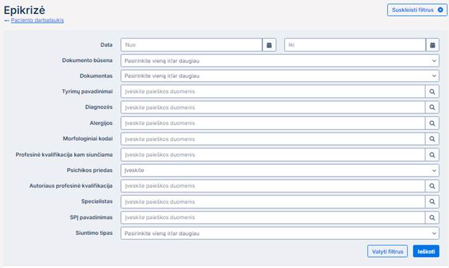 Norint susirasti konkrečią epikrizę reikia paspausti mygtuką „Filtruoti“, tai atliktus atsidaro filtras:
