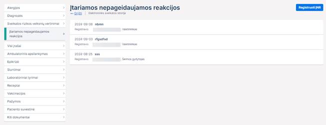 Paciento juostoje paspaudus Medicininiai įrašai ir atsidariusiame puslapyje paspaudus meniu punktą įtariamos nepageidaujamos reakcijos, atsidaro įtariamų nepageidaujamų reakcijų sąrašas: