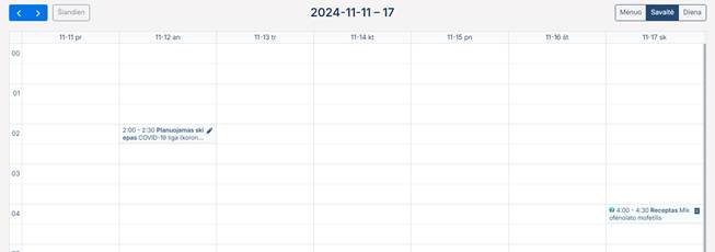 Pagal nutylėjimą, atidarius kalendorių, įrašai rodomi savaitės kalendoriumi. Naudotojas gali peržiūrėti: Išankstinės pacientų registracijos sistemos apsilankymus, Suplanuotus skiepus, Recepto išrašymo faktus ir galiojimo datas, Vaisto išdavimo faktus ir pakanka iki datas ir Slaugos paslaugos namuose (skaityti skyriuje 4.5.3 Peržiūrėti kalendoriaus įrašą savaitės forma), mėnesio (skaityti skyriuje 4.5.2 Peržiūrėti kalendoriaus įrašus mėnesio forma) arba dienos (skaityti skyriuje 4.5.1 Peržiūrėti kalendoriaus įrašus dienos forma) forma, paspaudus mygtuką atitinkamai Mėnuo, Savaitė arba Diena lango viršuje kairėje.