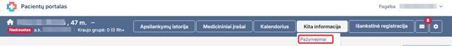 Kita informacija puslapyje galima peržiūrėti paciento, kurio vardu dirbama, atsidaro papildomas meniu su vienus meniu punktu „Pažymėjimai“: