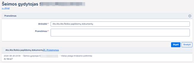 Puslapyje naudotojas gali užpildyti atsakymo į pranešimą informaciją ir išsiųsti pranešimą: