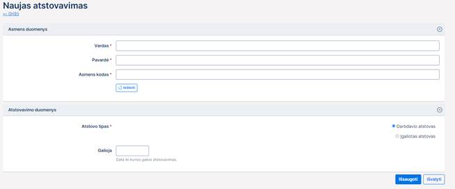 Užpildžius duomenis Naujas atstovavimas puslapyje, galima pasirinkti išsaugoti pakeitimus (Išsaugoti) arba išvalyti puslapyje atliktus pakeitimus (Išvalyti):