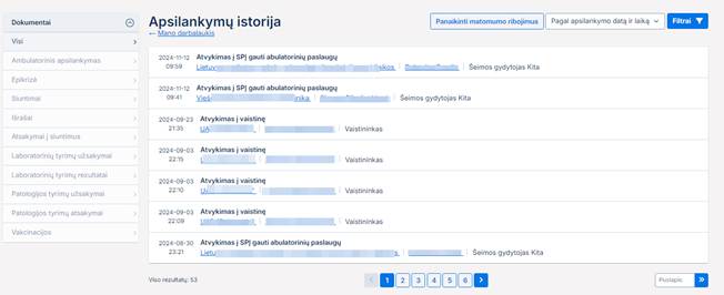 Apsilankymų istorijoje matomas visų pacientui, kurio vardu naudotojas prisijungęs, registruotų apsilankymų ir prie jų sukurtų elektroninių dokumentų sąrašas.