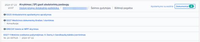 1. Peržiūrėti apsilankymo dokumentus, paspaudus Dokumentai nuorodą prie apsilankymo ir išskleidus dokumentų sąrašą (jei jis dar neišskleistas).