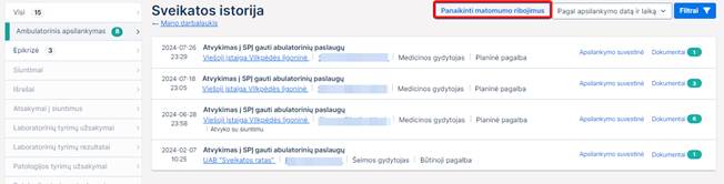 Apsilankymai, kurių metu nebuvo sukurti dokumentai, nėra šalinami sistemos po tam tikro laiko ir pacientas visus tikrinančių institucijų/ūkio subjektų apsilankymus galėtų matyti bendrame („Visi“) apsilankymų sąraše.