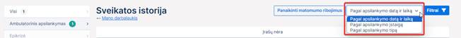 19 paveikslas. Apsilankymų rūšiavimas paciento sveikatos istorijos puslapyje