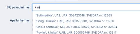 rodomi pasirinkimai pagal įvestą užklausą.