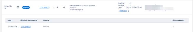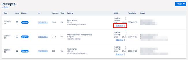 Naudotojas receptų sąraše gali peržiūrėti konkrečiam receptui išduotus vaistus. Tai jis gali padaryti prie recepto paspausti Išdavimų: xx nuorodą.