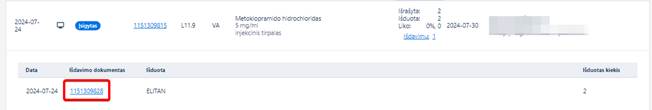Naudotojas galo peržiūrėti konkretų išdavimą paspaudės ant išdavimo dokumento numerio: