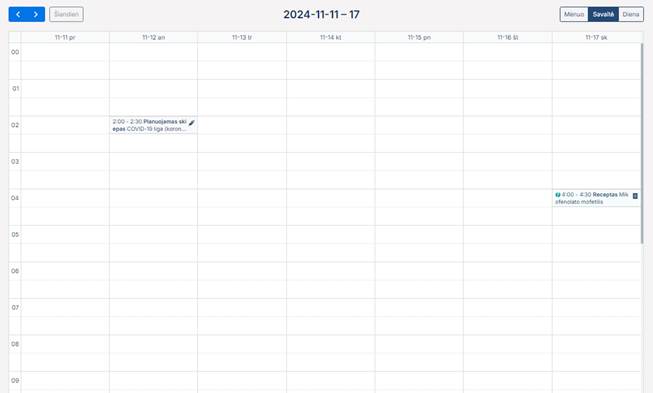 Prisijungęs naudotojas gali atidaryti kalendoriaus įrašų peržiūrą savaitės forma: