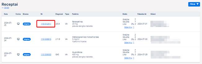 Naudotojas receptų peržiūros bloke gali atidaryti pasirinktą e. receptą detaliai peržiūrai. Peržiūra iškviečiama paspaudus ant dokumento numerio nuorodos atrinktame sąraše.