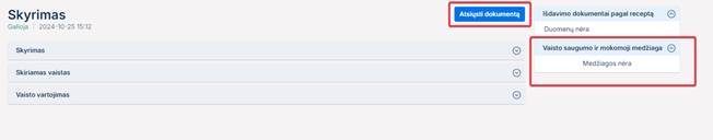 Naudotojas recepto peržiūros lange gali peržiūrėti konkretaus e. recepto duomenis, atsisiųsti recepto PDF dokumentą į savo kompiuterį (mygtukas Atsisiųsti dokumentą), taip pat peržiūrėti vaisto saugumo ir mokomąją medžiagą, informacinį lapelį.