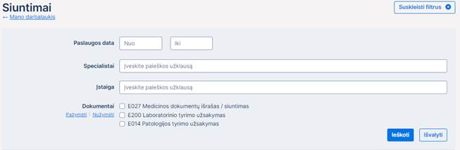 Pasirinkus punktą Išvalyti paiešką, ankstesnės paieškos rezultatai išvalomi ir sąraše rodomi visi paciento siuntimai.