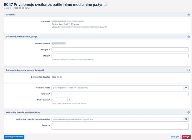 3. Dokumento duomenys, paciento darbovietė.