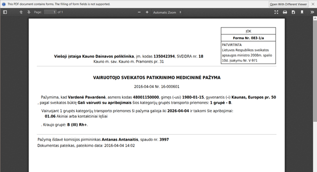 Sistema parodo naudotojui medicininės pažymos pdf dokumentą, pasirašytą kvalifikuotu elektroniniu parašu. Naudotojas gali peržiūrėti dokumentą ir išsisaugoti jį savo kompiuteryje.