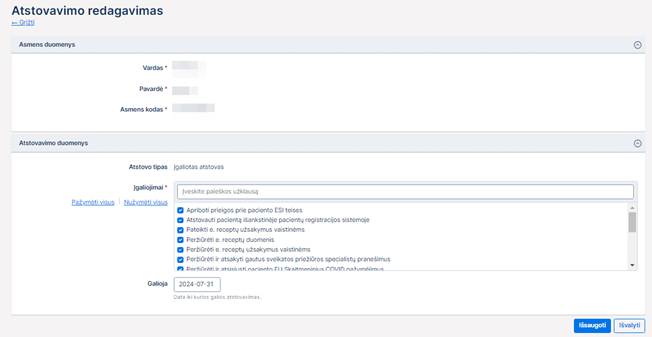 Redaguojant atstovavimą bloke Asmens duomenys nurodytų paciento atstovo duomenų keisti neleidžiama.