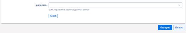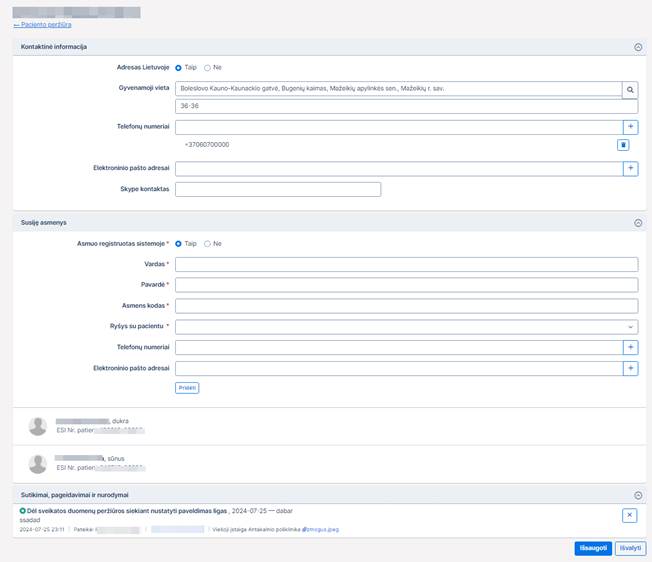 Susiję asmenys bloke naudotojas gali pridėti arba pašalinti paciento susijusius asmenis (vaikus, tėvus, sutuoktinį ir pan.). Nurodant susijusį asmenį, įvedami duomenys: