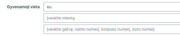 Jei adresas Lietuvoje. Laukuose vedant tekstą, vykdoma paieška adresų registre. Pirmasis laukas skirtas nurodyti gyvenamosios vietovės, savivaldybės (tik tuo atveju, jeigu adresas yra ne savivaldybės centre) ir gatvės kombinaciją. Antrasis laukas skirtas nurodyti namo, buto ir/arba korpuso numeriams. Pirmajame lauke vedant pavyzdžiui gatvės ar miesto pavadinimą ar jo dalį, sistema rodo rezultatus iš adresų registro pagal įvestą užklausą. Užpildyti neprivaloma.