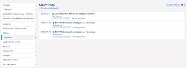 Paciento juostoje paspaudus Medicininiai įrašai ir atsidariusiame puslapyje paspaudus meniu punktą Siuntimai, atsidaro siuntimų sąrašas: