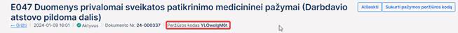 Sistema sugeneruoja naują pažymos peržiūros e. sveikatos viešajame portale kodą, kuris parodomas atnaujinto pažymos peržiūros puslapio antraštėje: