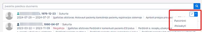 57 paveikslas. Paciento įgaliojimo atstovavimui tvarkymas išskleidžiamame meniu