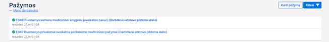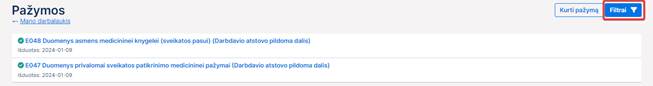 3. Filtruoti pažymų sąrašą, paspaudus ant puslapio kairėje, bloke Pažymos rodomos filtro nuorodos. Pagal nutylėjimą sąraše taikomas filtras Visos, prie kurio rodomas visų darbdavio atstovo pateiktų šiam pacientui pažymų dokumentų skaičius. Prie kitų filtro reikšmių rodomas skaičius, kiek pažymų dokumentų atitinka šį filtrą. Paspaudus ant filtro, nuoroda tampa neaktyvi, filtro pavadinimo tekstas paryškinamas. Naudotojas gali filtruoti sąrašą pagal pažymos dokumento būseną: