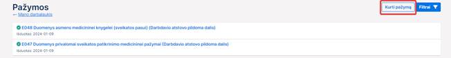 2. Kurti naują darbdavio pažymos dalį, paspaudus mygtuką Kurti pažymą viršutiniame dešiniajam puslapio kampe.