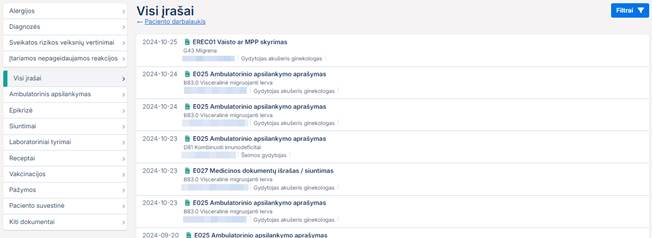 Paciento juostoje paspaudus Medicininiai įrašai ir atsidariusiame puslapyje paspaudus meniu punktą Visi įrašai, atsidaro visų įrašų sąrašas:
