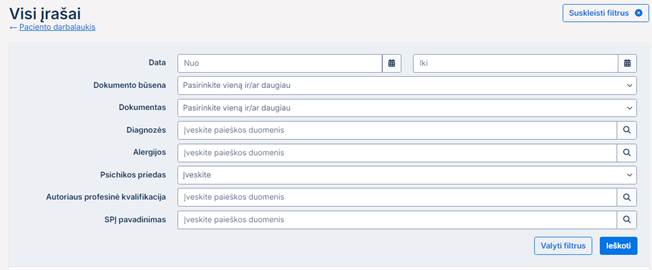 Norint susirasti konkretų įrašą reikia paspausti mygtuką „Filtruoti“, tai atliktus atsidaro filtras: